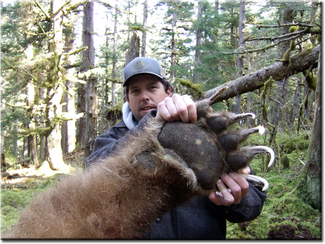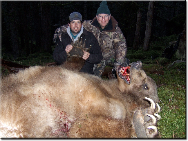He popped his jaw a couple of times, and with a big woof he was on the run. As I said before, the trees were so think we could only get glimpses of him as we were trying to run after him. Anybody who has been to Alaska knows that trying to run through the forest is like trying to run on a sponge . . . to say the least, it feels like a bad dream where your running in slow motion.