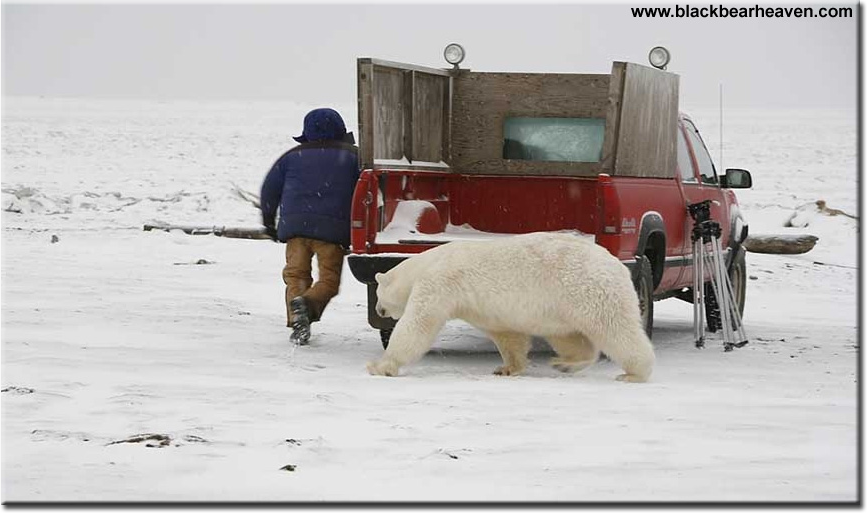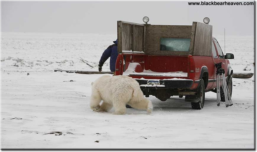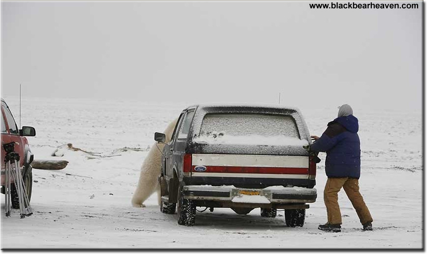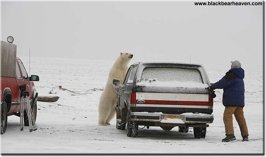 This is just a small bear. It's probably only 2 years old and on it's first year without its mother. A full grown male Polar Bear could get to be three times this size. Hiding in a truck or car would not save you. Any bear could smash though the car glass in seconds with little difficulty.