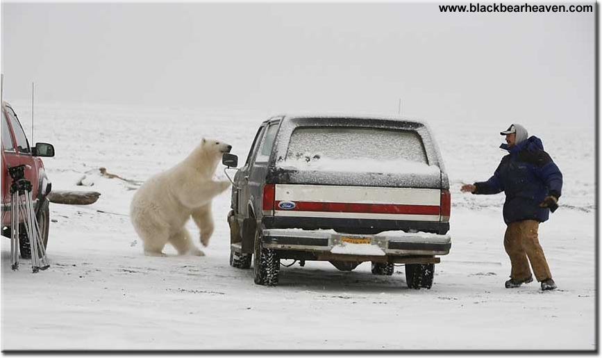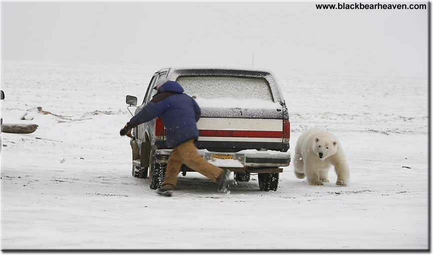 There are pictures from Barrow, Alaska. A photographer got careless and let the bear get too close and he did not have time to get into his truck before the Polar Bear started chasing him around the truck.